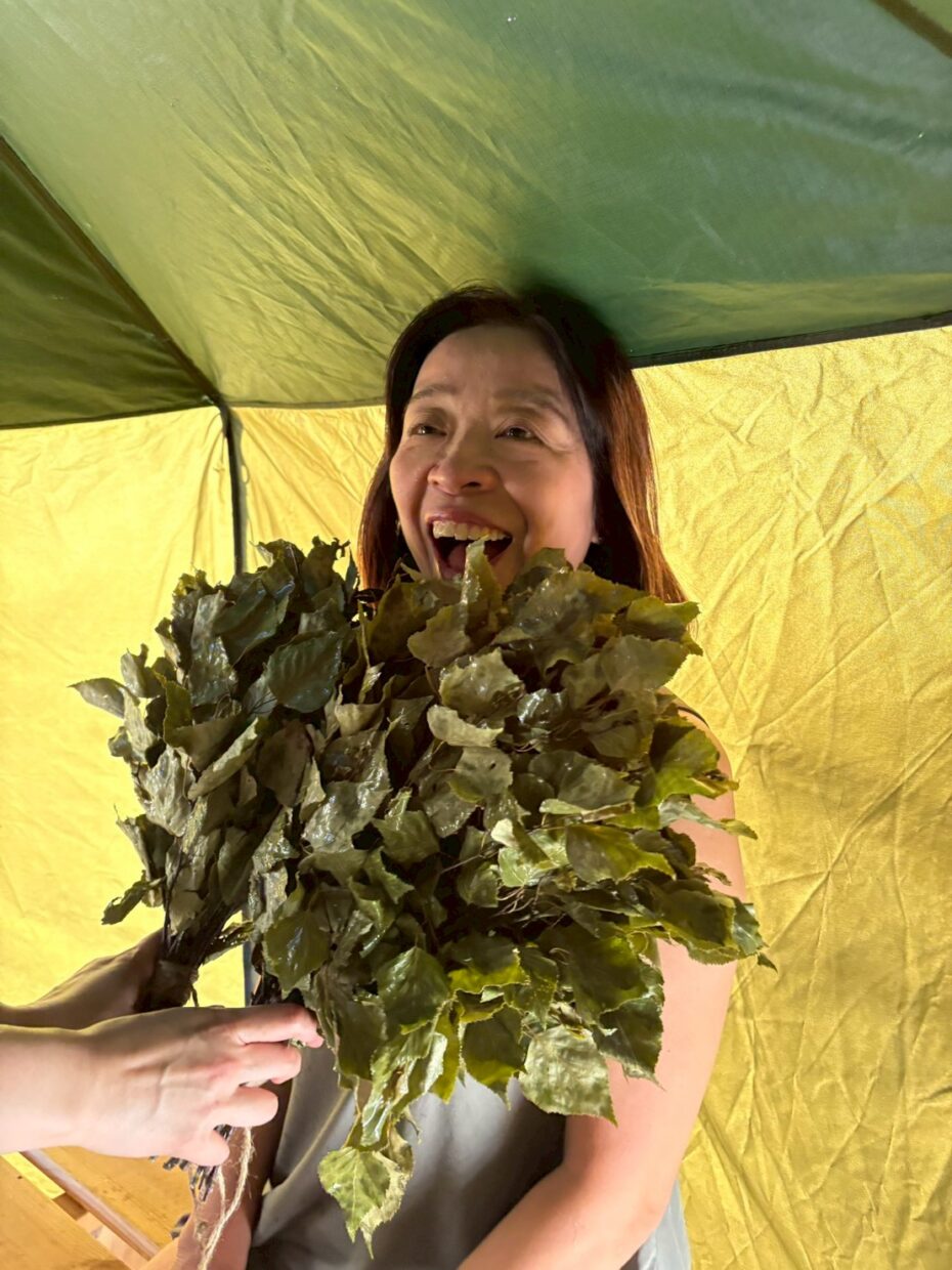 初めての白樺のウィスキングで香りに驚く様子