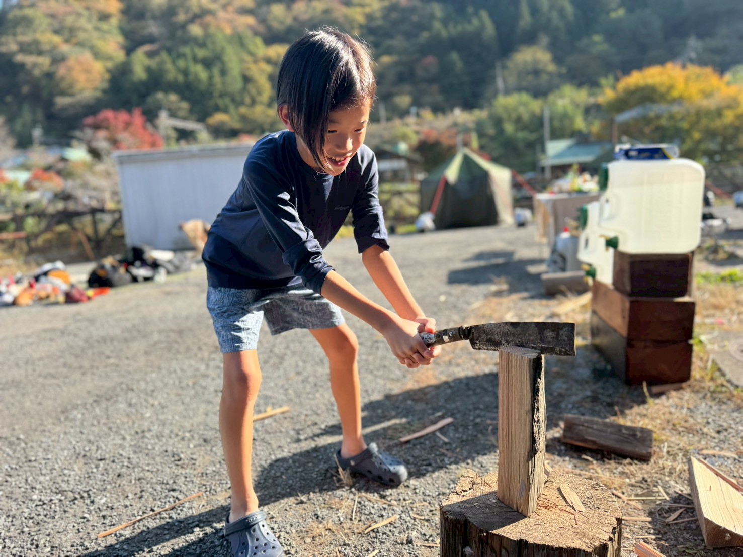 近隣の横瀬川周辺を散策して、植物を観察したり、クルミや栗の実を拾ったり、薪ストーブに使う薪割体験など。