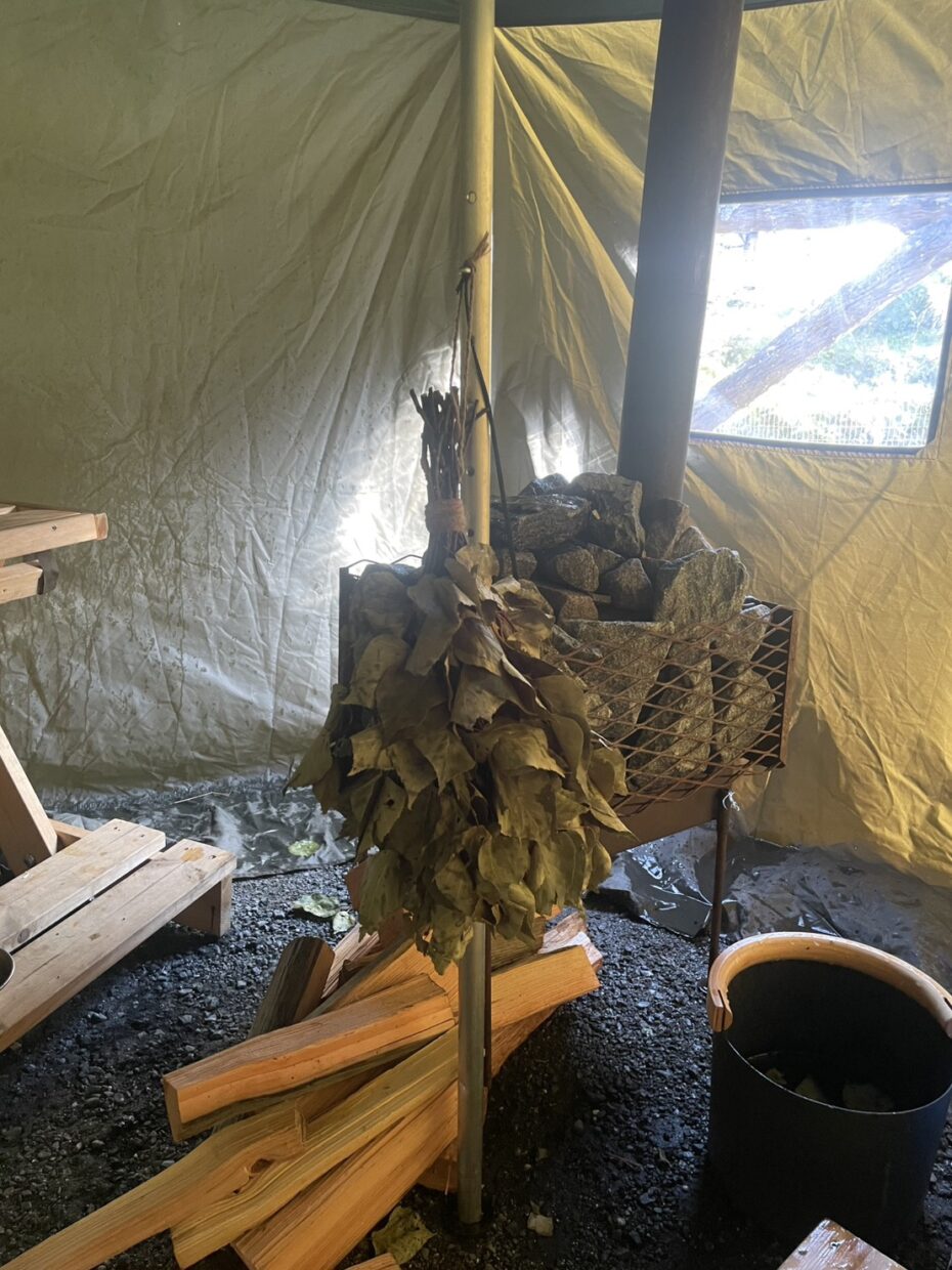 食事を楽しみながらサウナテントに入り始めます。サウナテントの中は薪ストーブの威力でほかほかの状態。