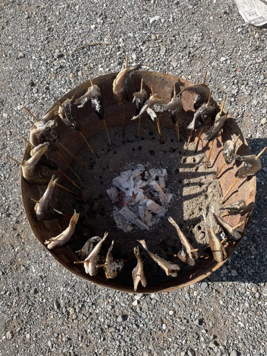 猟友会お手製の鱒ストーブで香ばしく焼き上げる
