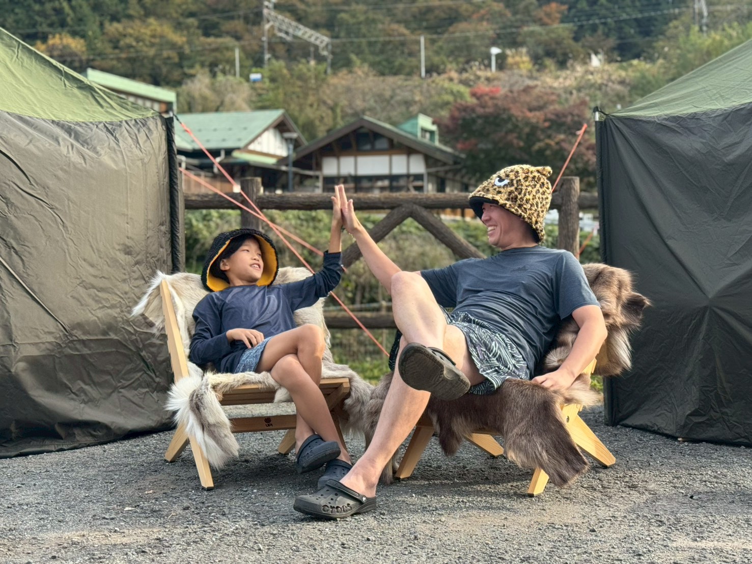 アウトドアグルメとサウナを楽しんだ親子のハイタッチ。トナカイファーがあたたかい。