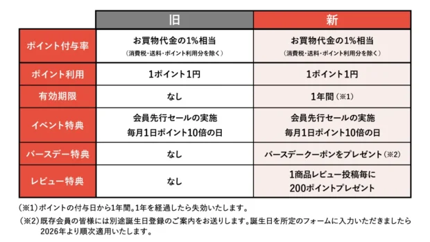 2026年1月より新たなポイントプログラムがスタートしますが、まだまだこれからも改善し更にお得に楽しくお買い物いただけるような企画を検討中です。こちらのご案内は今しばらくお待ちいただけますようよろしくお願いいたします。