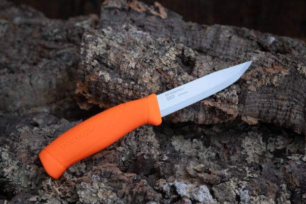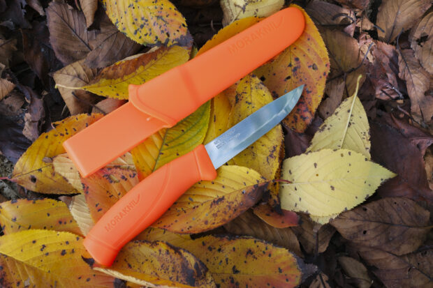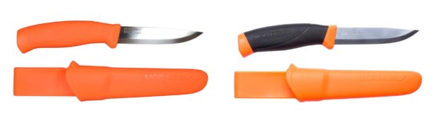 モーラナイフを代表するオールラウンドナイフ「コンパニオン (S)」。その中でも定番カラーのオレンジ (比較画像右) は、ハンドル部分がブラックとオレンジのバイカラーになったデザインが特徴です。