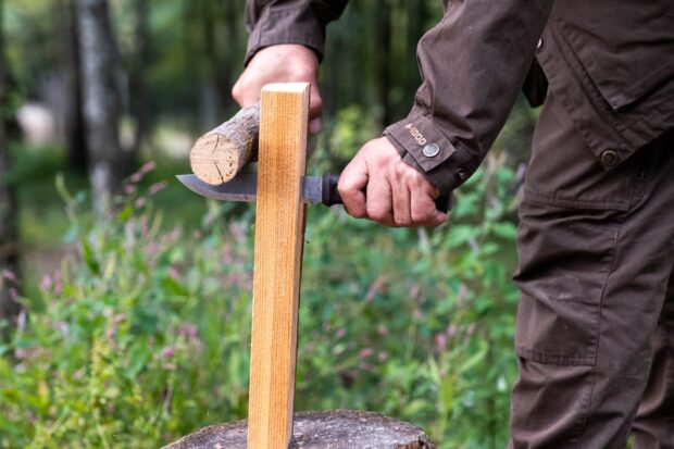 従来のガーバーグより長くなったブレードで、より大きな丸太などのバトニングも可能に。大きくない木材を小割りにする際にも、ブレード先端部分の飛び出す面積が多く、最後までスムーズに安定して叩くことができます。