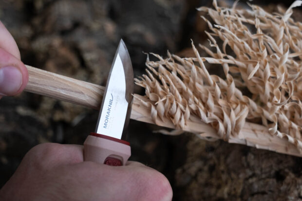 ブレードの厚みが2段階になったユニークな構造で、薄い先端では食材に刃を入れて少しずつカットするような細かい作業をしたり、刃元ではフェザースティックを作ったりロープを切ったり、ナイフの背部分とファイヤースターターを利用して着火したりと、小さいナイフでもたくさんの繊細な作業をこなせます。