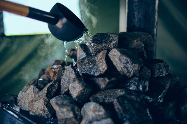 薪ストーブで熱された石に水をかけてロウリュのミストを楽しむことができる。着衣のままでOK!
